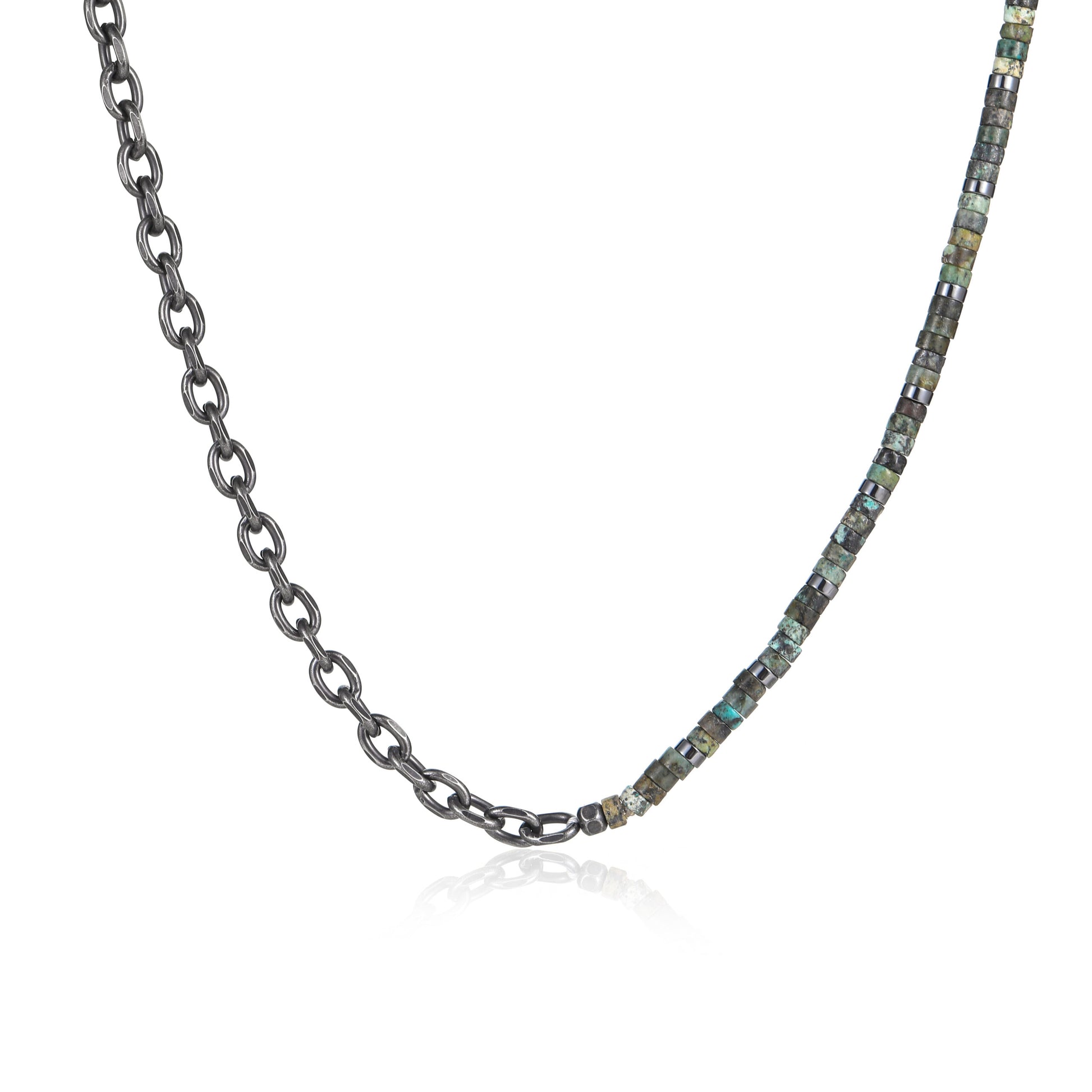 השרשרת דואל לגבר זו שרשרת שמשלבת שני עולמות. שילוב ייחודי של חוליות שחורות מצד אחד, וצד שני חרוזים ירוקים טבעיים. שרשרת שמוסיפה סטייל מחוספס ומתוחכם ומשדרגת כל לוק